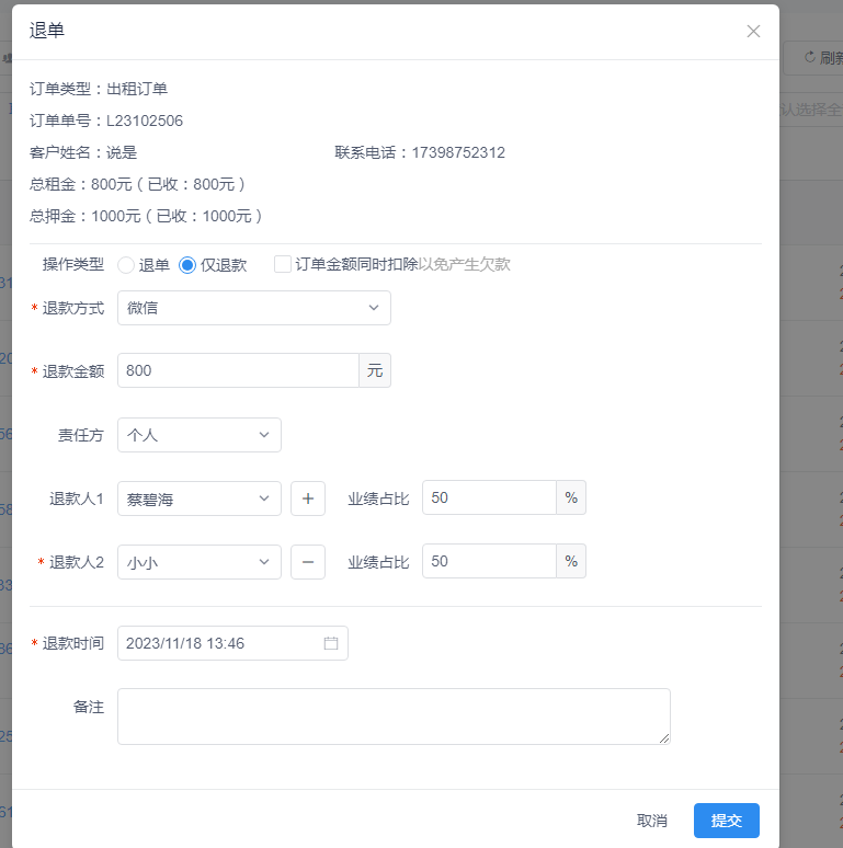 二、增加退款业绩责任分配功能,责任可归属多人,并扣除其对应的当月业绩。
