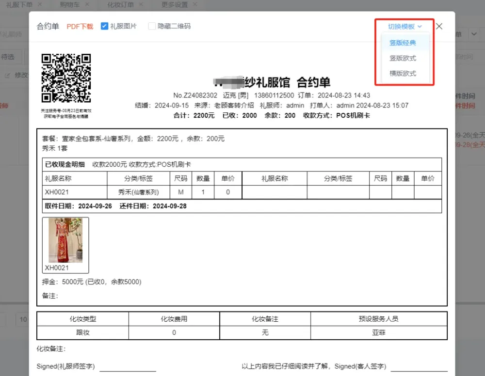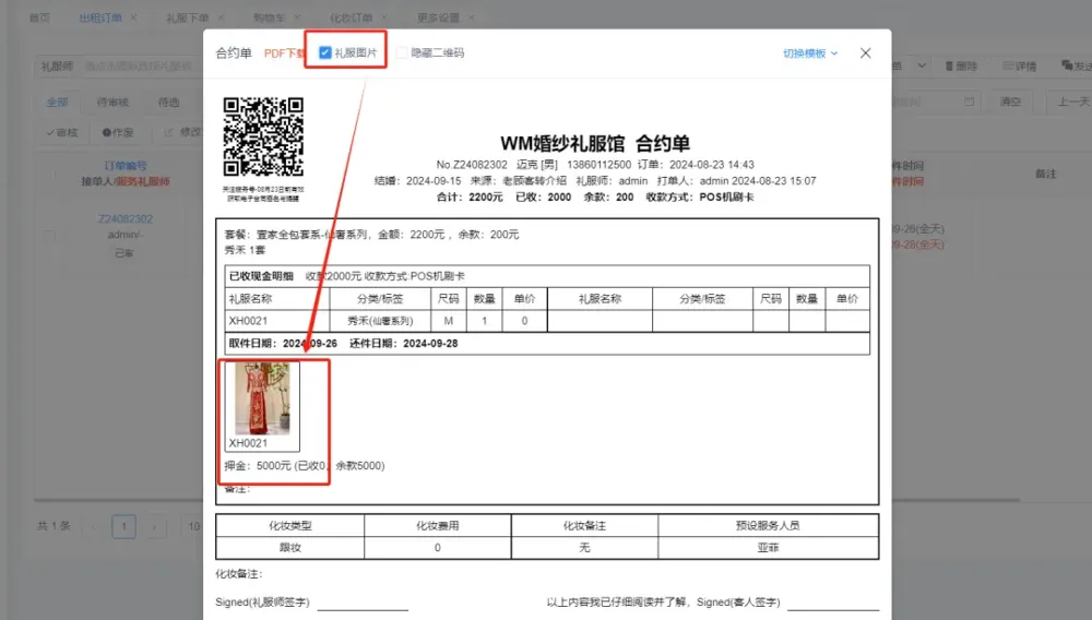 1:礼服合约单可以打印选款礼服照片